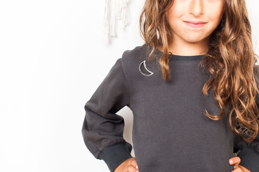 Super cozy washed French Terry fleece pullover, features metallic embroidery design and mesh insets at front and back and a cute puff sleeve.
