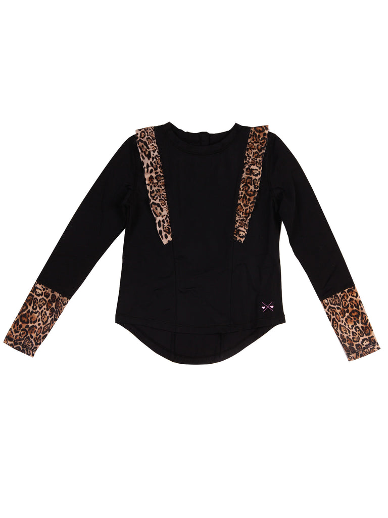 Leopard-print ruffles add a touch of feline flair to a soft, stretchy black rashguard perfect for keeping her skin protected from the sun's harsh rays during long days at the beach