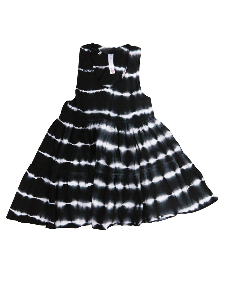 - Black and white tie-dye cotton slub tiered racerback tank with raw hem