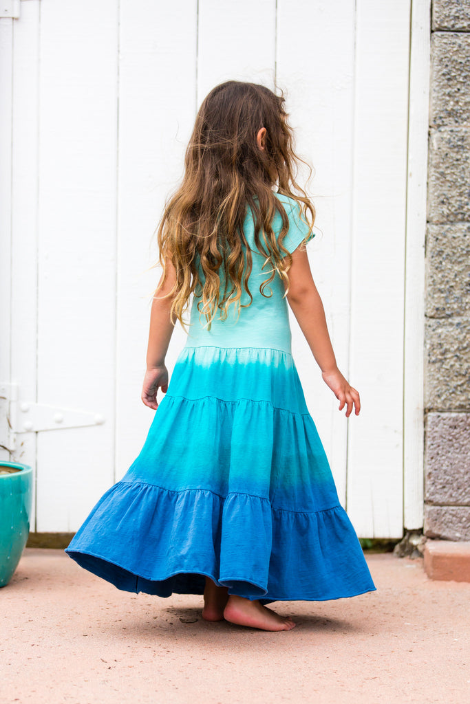 - Shades-of-the-sea ombre cotton slub t-shirt style maxi dress with raw hem and sheering details.