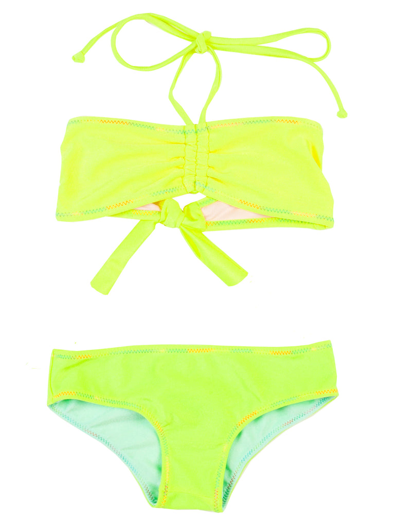 * Shiny electric yellow bandeau style top with adjusting straps paired with electric yellow boyshort bottoms that reverse to sea foam. Rainbow zig zag stitch detailing.